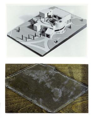 The distinction between a HALFTONE autotype versus line-drawn source is nicely visualized through a set of original drawings, photographs, and PROCESS BLOCK of architectural plans and blueprints by Vít Obrtel, which are held in his archive at the Národní technické muzeum (National Technical Museum) in Prague. Pictured here are two process blocks rendered from line drawings of his 1933 Funkcionální vila (Functional Villa) from north and south views. In another example, a three-dimensional model for a different villa has been photographed; the negative of this photograph would have then been used for transferring the image via the HALFTONE SCREEN process to a metal plate and finally affixed to type-high wood ready for LETTERPRESS printing. The result of creating these PROCESS BLOCKS—which is their printing in serial form—can be found in the Fall 1933 issue of Kvart, an architectural magazine under Obrtel’s editorship.